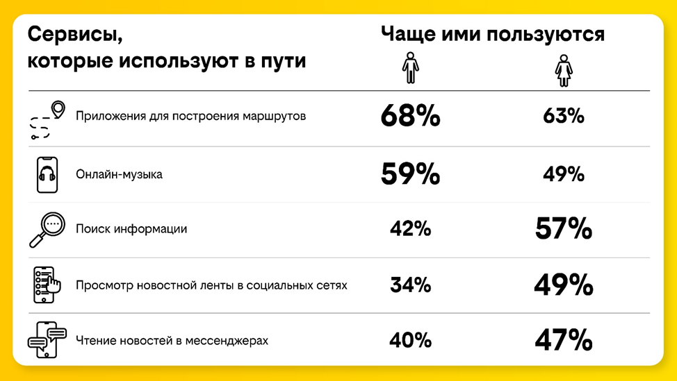 Интересно, что у респондентов разного пола и возраста наблюдаются достаточно заметные различия в использовании онлайн-сервисов в транспорте. Так, женщины в пути значительно чаще, чем мужчины, просматривают новостную ленту в социальных сетях (49% и 34% соответственно) и публикуют там же фотографии и видео (37% и 26%). Мужчины в дороге чаще отдают предпочтение музыкальным онлайн-сервисам (59% против 49%).