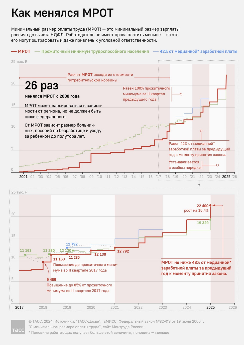 В пояснительной записке отмечается, что законопроект подготовлен в целях реализации задачи, поставленной президентом России Владимиром Путиным, по повышению минимального размера оплаты труда опережающими темпами и обеспечению роста МРОТ к 2030 году более чем в два раза по сравнению с 2023 годом, до уровня не менее 35 тыс. рублей в месяц. "Законопроектом предлагается установить МРОТ с 1 января 2025 года в сумме 22 440 рублей (рост 16,6%). Соотношение с медианной заработной платой за предыдущий год увеличится до 48%. Медианная заработная плата за 2023 год, по данным Росстата, составляет 46 751 рубль", - отмечается в пояснительной записке.
