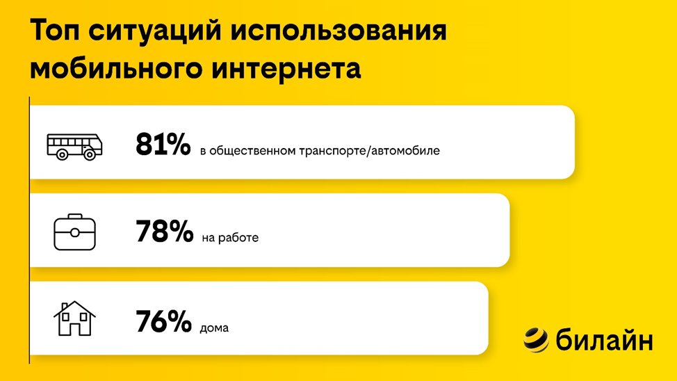 Оператор билайн провел опрос* среди своих клиентов, чтобы узнать, в каких ситуациях они пользуются мобильным интернетом. Самым популярным оказался вариант – при поездке в транспорте.